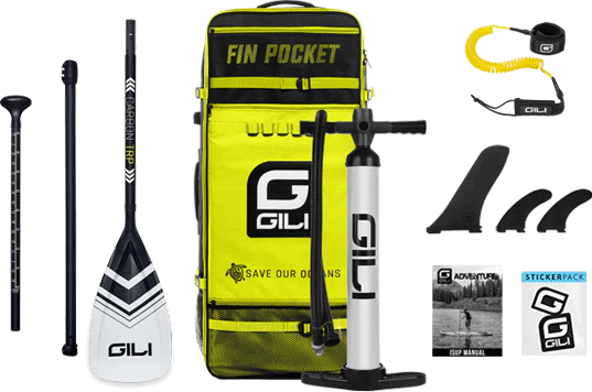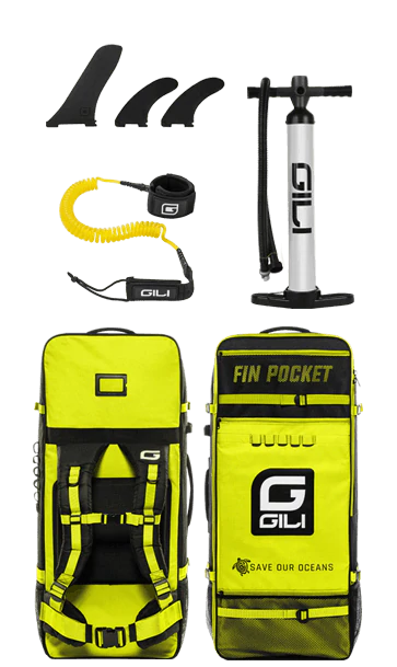 Complete iSUP Package: includes GILI Air SUP, Aluminum Travel Paddle, Inflatable Backpack, 2-Stage Hand Pump, 8' Coiled Leash, Snap-In Center Fin, Repair Kit